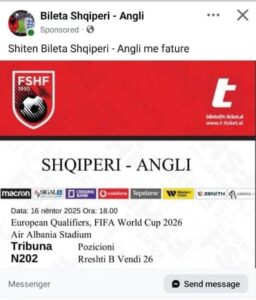 Bileta më e lirë për të ndjekur ndeshjen Shqipëri-Angli më 16 nëntor është ajo në zonat e stadiumit të emërtuara E101, N106 apo E109, S101 apo thenë ndryshe, këndet e stadiumit që ndodhen tek goditja e këndit. Çmimi për këto vende është 2500 lekë.